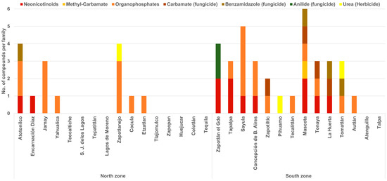 Number of compounds of each of seven families of pesticides detected in honey samples collected from honey bee hives in 16 municipalities of the north zone and in 14 municipalities of the south zone in Jalisco, Mexico.