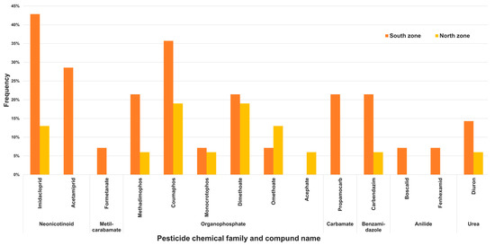 There were significant differences for pesticide frequency between the two zones (χ2 = 17.1, p < 0.05). Pesticides were detected in 86% of the south zone samples, compared to only 44% in the north zone samples. Moreover, neonicotinoids were detected more frequently in the south zone than in the north zone. For example, imidacloprid was found in 43% of the south zone samples, compared to only 13% of the north zone samples. The most frequent compounds in samples from the north zone were dimethoate and coumaphos (19%), and the least frequent were monocrotophos, acephate, carbendazim, and diuron (6%). In the south zone, the pesticide most frequently detected was imidacloprid (43%), whereas the pesticides least frequently detected were formetanate, boscalid, and fenhexamid (3.3%). Imidacloprid was detected significantly more frequently than these three pesticides (χ2 = 4.7, p < 0.05; Figure 3).