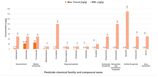 The pesticides found were grouped into families according to the databases of the Pesticide Action Network [44], and their frequency and concentrations (ng/g) were analyzed.