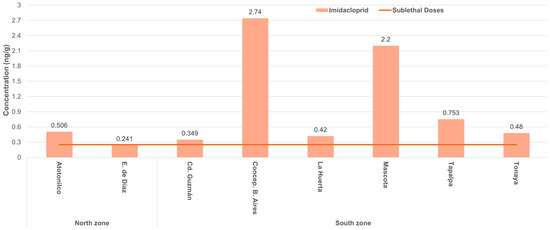 Concentrations of imidacloprid in honey samples collected from honey bee hives from the north and south zones of Jalisco, Mexico, compared with sublethal doses of the pesticide for honey bees (red line), according to Williamson and Wright (2013) [46].