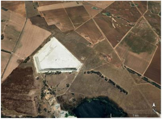 An isolated and representative tailings dam (Figure 1) located in Lejweleputswa District Municipality, Free State Province, (South Africa) between Odendaalsrus (−27°51′59.99′′ S, 26°40′59.99′′ E) and Allanridge (27°45′15.52″ S, 26°38′37.75″ E) towns was selected for the study. This dry, dormant tailings dam contains gold mine tailings from an old, closed mine shaft located in the southern part of the dam. The tailings dam is bordered by a township to the north, the R30 main road and a vegetation farm to the west, a small pond, and a hostel with occupancy of about two hundred people to the southeast of the tailings. The nearest tailings dam is located approximately 5 km northwest of the tailings dam. This tailings dam is still “active” with wet sludge from the adjacent operational gold mine. Other tailings dams are located at 8.6 km and 16 km, respectively, on the south and south-east side of the tailings. There are no other tailings dams or other man-made sources in the north, north-east and east of the dam.