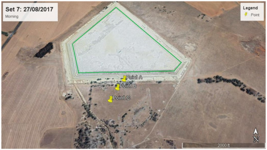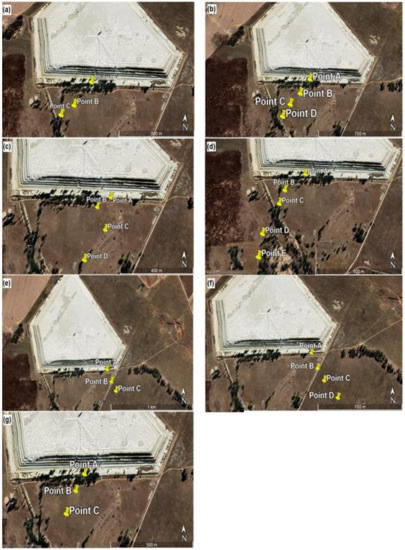 Receptor points for downwind measurements and their positions and distances from the tailings for (a) day 1 morning, (b) day 1 afternoon, (c) day 2 afternoon, (d) day 3 morning, (e) day 3 afternoon, (f) day 4 afternoon and (g) day 5 morning.