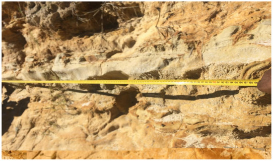All of the area and volume measurements used in the modelling were taken from Google Earth® and BREEZE software (Trinity Consultants. Inc., Dallas, TX, USA). These measurements assumed that the sides of the dam were smooth surfaces. However, the lateral surfaces of the dam have developed fractures and fissures due to aging and years of erosion, resulting in rough structures with grooves which represent a larger surface area than the projected one as illustrated in Figure 5. While the emission rates per unit surface area are likely to be the same, the larger surface suggests a higher overall emission from the side areas than the flat top surface [29].