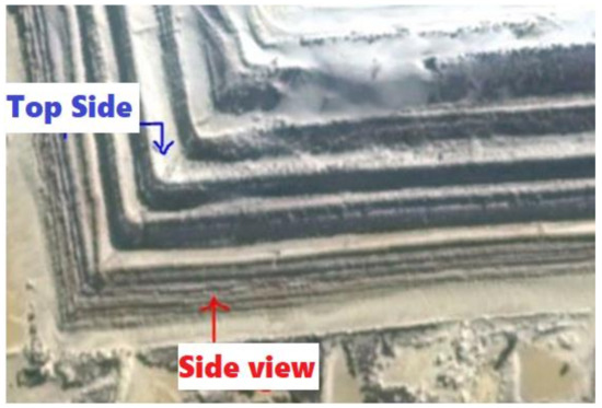 In this emission scenario, the tailings dam was modelled as an area source by considering the total true emitting surface area of the dam. The dam’s whole geometry and dimensions were accounted for, including the slopes on the sides (35°), the height (30 m), the top surface layer, cracks, gulleys and fissures on the side walls of the dam. To model the dam as accurately as possible, the dam was further sub-divided into multiple areas to account for different dimensional variations at each side area. Each of the five sides was divided into ten area segments in accordance with the dam’s design (steps or benches); that is, five top views and five side views. This is illustrated in Figure 6.