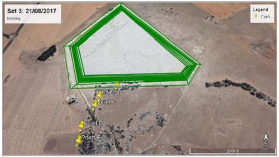 A sensitivity analysis was carried out by separately modelling radon contribution from each of the five sides of the tailings dam to establish the impact of individual sides of the dam towards incremental radon concentration at different discrete receptor points downwind. Moreover, 2 representative days (day 3 morning and day 4 afternoon) were chosen for this purpose. Each side was modelled as multiple area source elements as described in scenario 1 and their individual contributions were compared. An example of the modelling protocol for day 3 (side A) is illustrated in Figure 8.