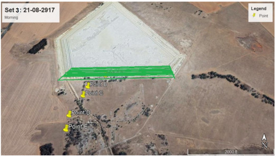 Discrete Cartesian Coordinates for 26 receptors at the height of 1.5 m above ground were used in the modelling. These 26 receptor points were chosen based on the hourly radon measurements obtained as part the broader study on Validation of radon dispersion modelling from tailings dams. In the approach of following the wind direction, radon was measured downwind in the direction of the wind, starting from a point that was closest to the tailings (source) at time intervals of about 1 h between successive measurements from the base of the tailing. These measurements, taken in the mornings and afternoons over a period of five days consecutively (Figure 3), were carried out with Alpha GUARD PQ2000 PRO pulse ionisation chamber (Saphymo GmbH, Frankfort, Germany) which was operated in flow mode with 10-min cycles.
