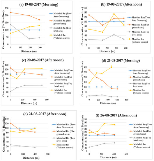 As expected, the flat ground-level area source concentrations were higher than other source terms. In comparison to the baseline, 74% of the findings for the flat ground source term from a total of 25 simulations yielded overestimated radon concentrations that were 1.04–2.74 times higher than the true geometric area source. When compared to the true geometry area source, the remaining 24% of the flat ground area source underestimated radon concentrations by factors of 0.83–0.96. The highest flat ground-level area values were observed in the mornings along the south-west wind direction, producing high estimations at distances near to the tailings. The biggest overestimation of 2.73 higher than baseline was obtained on day 3 (21 August 2017) morning at nearfield distance very close to the tailings as depicted in Figure 11d.