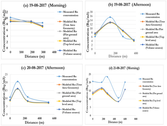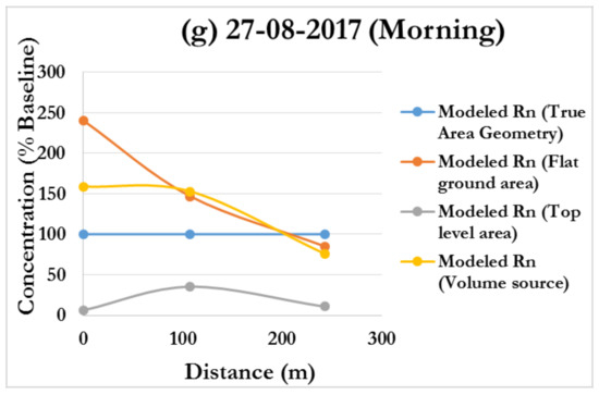 In terms of various peaks and dips, the graphical patterns in Figure 12a–g demonstrate that measured and modelled curves follow a similar trend. Except for (e), (f), and to some extent (g), there appears to be good agreement between measured and modelled radon in terms of radon distribution trend at various distances from the source in all these cases. The curves deviate significantly at two locations in cases (e) and (f), but only at one point in case (g). Surprisingly, when compensated for wake effects, all of the source geometries appear to provide nearly same results.