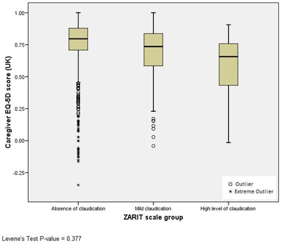 After checking the homogeneity of variances with Levene’s test, ANOVA analysis was used to evaluate differences in EQ-5D index (crosswalk values) between the caregivers group according to the caregiver’s burden defined by ZBI groups (absence of claudication, mild claudication and high level of claudication). The Bonferroni correction was used for multiple comparisons (Pc, corrected P-value).