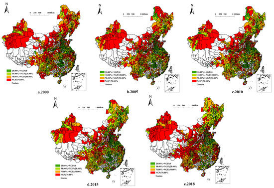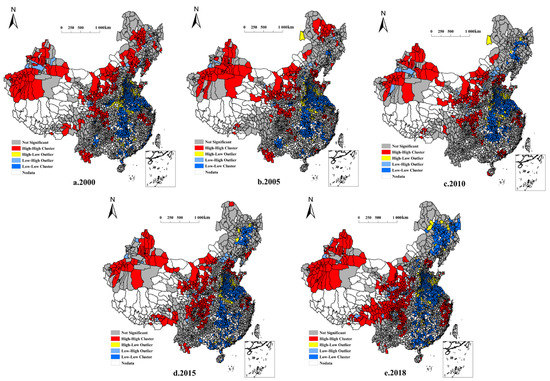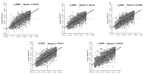 Significance tests were performed on the global spatial autocorrelation of NGPR. From 2000 to 2018, the global spatial NGPR autocorrelation passed significance tests at the 1% level, indicating that NGPR has a strong spatial correlation. The global Moran′s I values for NGPR in 2000, 2005, 2010, 2015, and 2018 were 0.310, 0.274, 0.271, 0.254, and 0.325, respectively. These values indicate a positive spatial autocorrelation. The NGPR distribution was thus spatially clustered, and the degree of spatial clustering increased over time (Table 3).