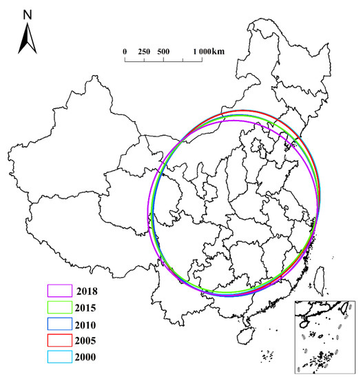 Standard deviation ellipse analysis (Figure 2) revealed that the angle of the standard deviation ellipse changed from 56.40° in 2000 to 76.06° in 2018, thus revealing a pattern related to the spatial concentration and evolution of NGPR. This result indicates that NGPR is directed from “northeast to southwest.” The spatial NGPR pattern is also decentralized. Specifically, the long axis of the standard deviation ellipse gradually shortened from 2000 to 2018, whereas the short axis remained largely unchanged. Under the combined action of the long and short axes, the eccentricity gradually decreased. Further, the area of the standard deviation ellipse gradually decreased from 4.33 × 108 ha in 2000 to 4.18 × 108 ha in 2018, thus exhibiting a clear decentralization trend.