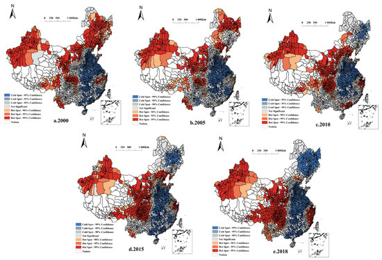 The stable distribution of NGPR with H-H clustering was primarily observed in Xinjiang, the Sichuan Basin, and in parts of the Loess Plateau. From 2000 to 2018, the overall change in NGPR coverage was characterized as “stabilizing in the northwest and expanding to the southwest”. Most of the stable distribution of NGPR with L-L clustering appeared in the Huanghuaihai Plain and parts of the middle and lower reaches of the Yangtze River. The overall coverage from 2000 to 2018 showed that coverage was “stable in the southeast and expanding to the northeast.” The NGPR areas with H-L and L-H clustering were small and sporadic, mainly occurring in peripheral regions adjacent to H-H and L-L clusters. In addition, hot spot analysis indicated the presence of NGPR hot spots in the west, and cold spots in the east. These results corresponded to the LISA cluster distribution map, further supporting the significance of the observed high- and low-value clusters (Figure 5).