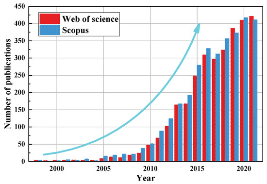 Evolution of publications on FO (last updated on 2 June 2022. The keywords used in searching both Web of Science and Scopus were “forward osmosis”).