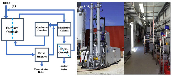 (a) Block flow diagram of the membrane brine concentrator (MBC) (darkening color gradation indicates concentration of a stream, while a lightening color gradient indicates dilution; flows from the distillation column and brine stripper to the condenser are gas flows); (b) Photographs of the exterior and interior of the FO MBC pilot system [29] (Reprinted with permission from Ref. [29] McGinnis et al., 2013).