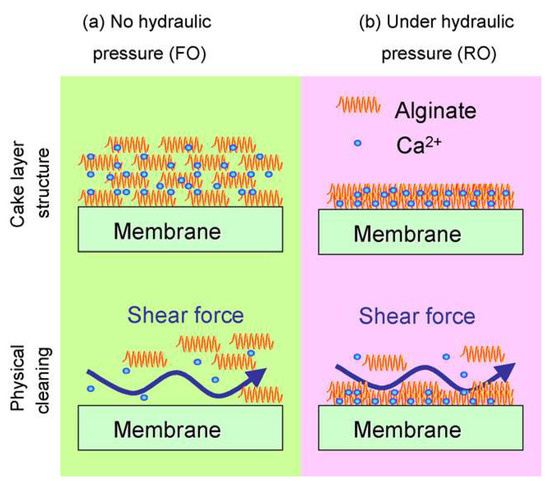 Schematic diagram of fouling and cleaning: (a) the lack of hydraulic action causes the alginate fouling layer to loosen, resulting in effective physical cleaning; (b) hydraulic action makes the alginate fouling layer dense, resulting in low cleaning efficiency [32] (Reprinted with permission from Ref. [32] Mi et al., 2010).