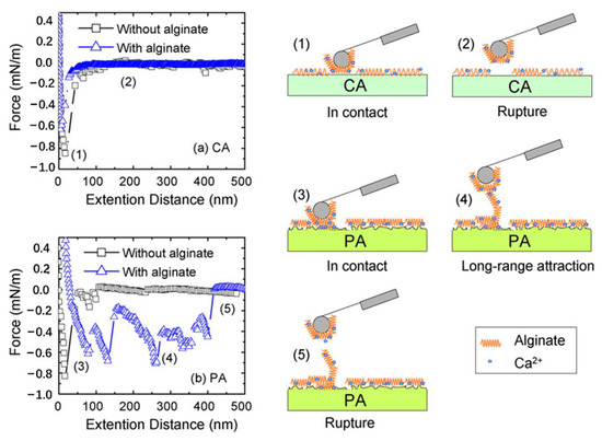 Schematic illustration of cellulose acetate (CA) and polyamide (PA) membranes with/without alginate (all of the test solutions contained 50 mM NaCl and 0.5 mM CaCl2): (a) representative adhesion force curves for CA membrane with/without 20 mg/L alginate; (b) representative adhesion force curves for PA membrane with/without 20 mg/L alginate; (1 and 2) schematic illustration of the retraction of the probe on the surface of the CA membrane; (3–5) schematic illustration of the retraction of the probe on the surface of the PA membrane [32] (Reprinted with permission from Ref. [32] Mi et al., 2010).