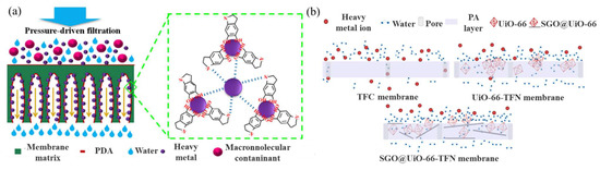 (a) Mechanism of the adsorption of heavy metal ions on a PDA membrane [36]; (b) heavy metal ion removal and antifouling mechanism of TFC, UiO-66TFN, and SGO/UiO-66TFN [37].