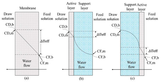 Schematic illustration of concentration polarization in the FO process: (a) symmetrical dense membrane; (b) asymmetric membrane with the porous supporting layer facing the feed; (c) asymmetric membrane with the porous supporting layer facing the draw (C represents the solute concentration; ΔΠeff represents the effective driving force).
