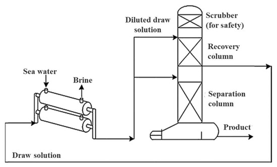 In the energy consumption studies, a pilot-scale NH3/CO2 membrane brine concentrator was tested by McGinnis et al. [29], a block flow diagram of which is shown in Figure 3. The thermal energy consumption of the system was only about 275 kWh per cubic meter of water produced, around 57% lower than that estimated for a traditional concentrator, operated in a similar single-stage, non-mechanical vapor compression configuration. Moreover, for a mechanical vapor compression configuration using electrical energy, the membrane brine concentrator required 42% less electrical energy than a conventional forced-circulation mechanical vapor compression evaporator. A membrane process that is reliant on a thermal drive or hydraulic drive consumes more energy and the process costs can be reduced by using an FO process. Currently, the costs of commercial FO membranes range from tens to hundreds of dollars per square meter, mainly because of low industrial demand. Their cost would be greatly reduced if they were mass-produced [30].