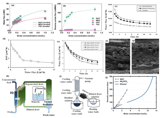 (a) water flux (points: experimental data, line: modeled data) with increasing draw concentration (SAS was not modeled because its diffusion coefficient could not be obtained from the literature); (b) comparison of reverse solute fluxes using food additives [68] (Reprinted with permission from Ref. [68] Yang et al., 2021); (c) variation of water flux with operation time at a controlled flow rate of 10 cm/s; (d) variation of reverse solute fluxes with water flux for deionized water feed and molasses draw; (e) effect of molasses draw flow velocity on water flux at a seawater feed velocity of 10 cm/s; (f) cross-sectional FESEM image of a pristine membrane in the molasses-drawn FO system; (g) cross-sectional FESEM image of a fouled membrane [69] (Reprinted with permission from Ref. [69] Bagheri et al., 2021); (h) schematic diagram of ethanol as a draw solute for FO; (i) schematic diagram of a laboratory-scale batch vacuum distillation unit; (j) experimentally measured water and reverse solute fluxes for NaCl, NH4HCO3, and ethanol draw solutions [70] (Reprinted with permission from Ref. [70] Kim et al., 2019).