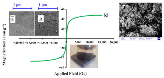 SEM images of fresh CTA membrane (a) and used membrane (b); magnetization curves (c) of Fe3O4@SiO2-SA in recovery process; and (d) FESEM images of Fe3O4@SiO2-SA after recovery [73] (Reprinted with permission from Ref. [73] Khazaie et al., 2021).