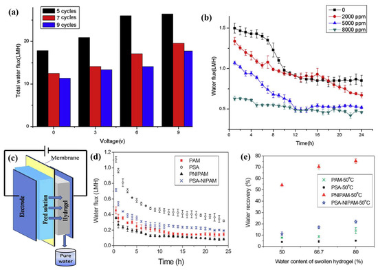 (a) Water flux of the as-prepared hydrogels over 24 h when different electric fields were applied; (b) water flux during 24 h FO using HA-PVA-5 hydrogel as traction agent. Different concentrations (2000, 5000, 8000 ppm) of deionized water and NaCl solutions were used as feed solutions; (c) schematic representation of an HA-PVA polymer hydrogel-FO desalination process [74]; (d) water flux during 24 h in FO process using polymer hydrogel and 2000 ppm NaCl solution as feed; (e) water recovery of swollen hydrogels (PAM, PSA, PNIPAM, and PSA-NIPAM) with different water loadings after dehydration at 50 °C for 2 min [75] (Reprinted with permission from Ref. [75] Li et al., 2011).