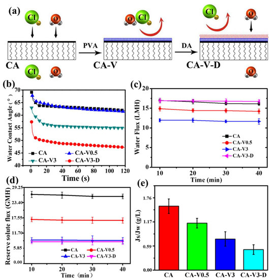 The performance of a pristine CA membrane in solute separation is inadequate, and conventional modification methods usually involve multiple steps, which are not conducive to controlled preparation. Ahn et al. [94] fabricated polyvinyl alcohol (PVA)-coated CA-based flat-sheet membranes, using PVA as a surface modifying agent, and tested them for water flux and solute separation. Concentrated NaCl solution 1.5 M was used as draw solution and the feed solution used deionized water. The modified membrane exhibited a water flux of 8.8 L/m2·h, 20% higher than that of a pristine CA membrane (7.4 L/m2·h), without salt leakage, indicating that the PVA coating improved the water flux performance for the FO processes. Based on the above-mentioned improvement of a CA membrane by PVA, Song et al. [96] further modified a high-performance CA composite FO membrane with polydopamine (PDA). As shown in Figure 14a, PVA was first cross-linked on the surface of the CA membrane, and then the PDA was applied by a rapid deposition method. As shown in Figure 14b,e, the modified membrane coated with PDA and PVA, designated as CA-V3-D, exhibited the best hydrophilicity and showed a water flux of 16.72 L/m2·h and a reverse solute flux of 8.19 g/m2 h, with deionized water as the feed solution and 2.0 M NaCl as the draw solution. The obtained CA-V3-D performed better when its selective layer faced the feed side. The simple and efficient modification method greatly improved the performance of the CA membrane and made it an excellent candidate for the further study of the CA membranes.