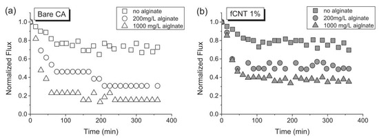 (a) Flux of bare CA membrane under different concentrations of alginates; (b) flux of 1% fCNT-CA membrane under different concentrations of alginates.