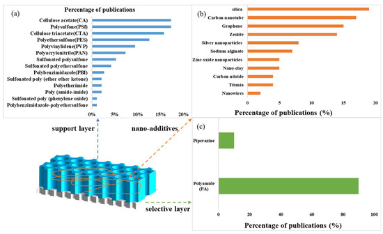Percentages of publications on polymers and nano-additives used for flat-sheet FO membranes and hollow-fiber FO membranes: (a) support layer materials; (b) nano-additives; (c) selective layer materials (modified from [17,76]).