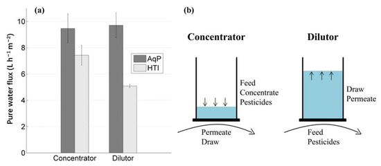 Inorganic salts, such as NaCl, MgCl2, KNO3, and MgSO4, can also be used as draw solutes in FO processes, by virtue of their good water solubilities and high osmotic pressures. To demonstrate the effectiveness of an integrated fertilizer-driven FO system, Dutta et al. [66] introduced an application of the dehydration of wastewater and brackish water, using inorganic fertilizers (KCl and NH4PO3) as draw solutes in a bench-scale unit with an ultra-low-pressure membrane, as shown in Figure 9a. An advantage of this application is that the diluted fertilizer draw solution can be directly used for fertilization, instead of separating the draw solute from the desalinated water. The results showed that reversible fouling was observed with >90% flux restoration, and low reverse solute flux of 1.74 g/m2 h NH4H2PO4 was achieved for the dewatering of the brackish water and wastewater concentration. However, the water flux of more than 2.72 L/m2 h was moderate. In terms of energy consumption, the energy consumption per cubic meter of diluted fertilizer solution was 8.8 kWh. Phuntsho et al. [54] also used different fertilizers (KCl, NaNO3, NH4Cl, and (NH4)2SO4) as the draw solutes for saline water desalination. According to the preliminary calculations, 1 kg of fertilizer could draw 11–29 L of water from a brackish water source. The KCl showed the highest pure water flux (22.85 L/m2 h), followed by NaNO3, NH4Cl, and (NH4)2SO4. The reverse solute flux of KCl (59.6 g/m2 h) was also the smallest. Similarly, but more economically, Volpin et al. [67] used a commercial fertilizer blend to concentrate real diluted urine. The experiments, using 2 L of real urine as the feed and 0.5 L of 0.5 M Mg(NO3)2·6H2O as the draw, were performed. During the concentration process, the urea in the urine was recovered as it diffused into the fertilizer. With 50% concentrated urine, 93% of the P was recovered, without the addition of external Mg2+; 50% N recovery was achieved in the diluted fertilizer draw solution. An economic analysis indicated that the total revenue of the process would be over 5.3 times the associated costs.