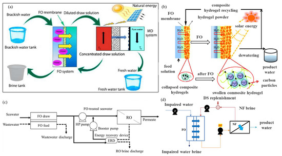 The systems for the FO water treatment are typically composed of three parts: a draw solution; a feed solution; and a membrane showing selective permeability. The membrane lies between the feed solution and the draw solution, separating the two parts. In such a system, the water molecules move from the feed solution side to the draw solution side; the FO process reduces with the decrease in the osmotic pressures and remains relatively static until the osmotic pressures on the respective sides are equal. The diluted draw solution can be reconstituted through secondary separation steps, such as nanofiltration (NF), RO, PRO, distillation, or the application of a thermal, magnetic, or electric field [17,18,19]. The following conditions must be met to realize the operation of the FO process [20]: (1) the draw solute must provide an effective driving force; (2) the selective permeable membrane or membrane module must allow the transport of the water molecules, while preventing the passage of the other solute molecules or ions.