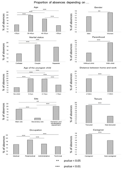 Proportion of absences depending on sociodemographic (age, gender, marital status, parenting, age of the youngest child, distance home/work) and professional variables (occupational groups, site, tenure, caregiver).