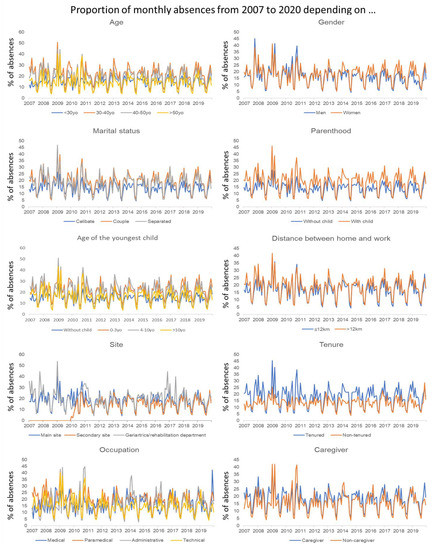 The very high number of absences in our data set since 2007 revealed a serious problem in health care institutions. Absenteeism has been increasing significantly in this field for several years and can lead to medical concerns with a decrease in the quality of care, organizational problems, and financial concerns due to high replacement costs. Certain factors generate more absences than others, mainly professional factors, but it is also interesting to consider the sociodemographic variables of the absent persons. We deduced from our study the following profile of absentees: having a youngest child over the age of 4, being aged between 30 and 50 years old, working in the administrative field, being tenured, being a parent, and being in a couple’s relationship. Moreover, this profile remained almost the same throughout the study period. The predictions of the VAR model for the next 2 years showed an evolution similar to that of the last 30 months, with peaks each year for the variables representing the largest proportions of absences and a slight decrease for the variables with a lower percentage of absences.