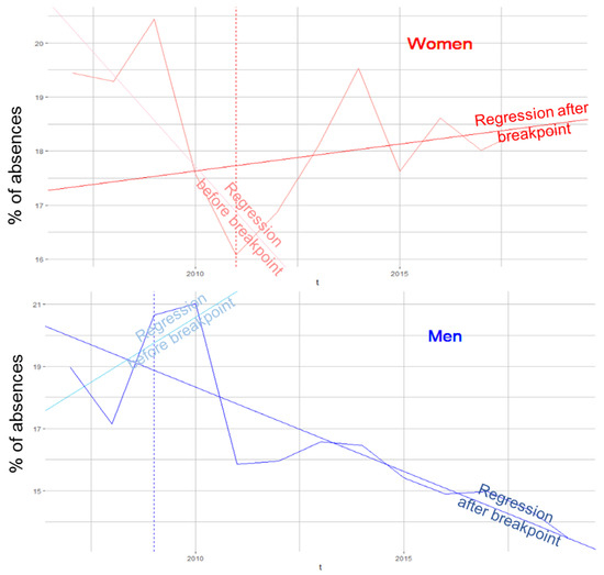 Next, we examined our data set as a time series to understand how the modalities of each variable changed over time. Plotting them graphically, we noticed that all modalities showed annual peaks. (Figure 2) These were periodic time series. The proportions of absences did not particularly increase; indeed, for most of the modalities, they stagnated around the average. Looking at the linear trend over time of each variable, a certain group of factors could be identified that had almost the same break point around 2011 and had since shown a slight increase in the proportion of absences. These were the only factors showing growth, on average, by +1.5% over the 2011–2019 period. This was the case for age groups 2 and 3, for women, people in couples, separated people, parents, people with a youngest child between 0 and 4, and tenured staff. The variables with the lowest proportions of absences were those with a declining trend for most of them. Among them, age group 4, single persons, persons without children, persons living less than 12 km from the UHC, non-caregivers, and the technical field had no or only one break point in 2009 and an average decrease of 1.5% in the proportion of absences. That decrease reached 5% for men over the 13 years of study. The example of the gender variable is shown graphically in Figure 3.