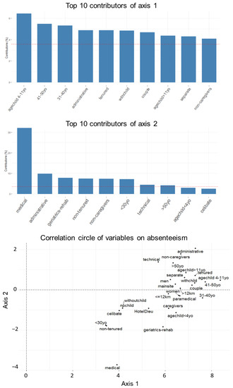 It was then interesting to see if the weight of each variable changed over time and if the profiles evolved. We then decided to separate our data set into three different periods to observe and compare the profiles of each. We had a 156-month data set, which was separated into three 52-month periods. We then performed a PCA on each time interval. The results of the first PCA, from January 2007 to April 2011, suggested that two axes should be retained. We chose to focus only on the first axis to compare the profile of the most absent among them according to the period. The largest contributors to axis 1 were those whose youngest child was between 4 and 10 years old (6.5% of contributions), those working in administration (5.6%), those between 40 and 50 years old (5.6%), tenured staff (5.3%), those between 30 and 40 years old (5.0%), parents (5.0%), those with a youngest child over 11 years old (4.9%), non-caregivers (4.9%), those in couples (4.8%), and the oldest people (>50 years old) (4.6%). The variables that were major contributors to axis 1 in the overall PCA were found. We noted only the presence of the oldest people and non-caregivers in the top 10 contributions of the first axis over the first period. In the second PCA, from May 2011 to August 2015, the results obtained were similar to those in the first period PCA. Indeed, the largest contributions of axis 1 were having a youngest child between 4 and 10 years of age (6.7% of contributions), being between 30 and 40 years of age (5.6%), working in administration (5.2%), being between 40 and 50 years of age (5.1%), being a parent (4.7%), being a tenured employee (4.6%), being in a couple (4.4%), being separated (4.2%), working in the paramedical field (4.1%), and living more than 12 km from work (4.1%). The differences to be noted, compared to the first period, were the appearance in the largest contributions of absences of separated persons, of those in the paramedical field, and of persons living more than 12 km from work. This meant that their proportions of absences were greater in the second period. Finally, the third PCA, from September 2015 to December 2019, confirmed the pattern found since the beginning of our analyses. In other words, the greatest contributions of axis 1 were having a youngest child between 4 and 10 years of age (5.9% of contributions), being between 40 and 50 years of age (5.5%), being between 30 and 40 years of age (5.2%), being part of a couple (4.7%), being a parent (4.7%), being a tenured employee (4.3%), and working in the administrative field (4.0%). However, there were new factors influencing absences recently. Indeed, having a youngest child between 0 and 3 years old (4.6%), being a woman (4.2%), and being in the medical field (4.0%) contributed much more to the last period than in the previous two. We could, therefore, deduce from these PCAs that a group of seven factors was always present in the top 10 contributions regardless of the period. Sensitivity analysis showed identical results with periods shorter or longer than 2 days.