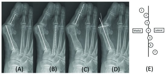 Preoperative angle measurements in a plain radiograph. Hallux valgus angle was defined as the intersection angle made by the longitudinal axis of the first metatarsal (solid) and proximal phalanx (dash) (A); The intermetatarsal angle was the intersection angle made by the longitudinal axis of the first (solid) and second (dash) metatarsal (B); Hallux valgus interphalangeal angle was the intersection angle made by the longitudinal axis of proximal (solid) and distal (dash) phalanx (C); Distal metatarsal articular angle was the intersection angle made by the longitudinal axis of the first metatarsal (solid) and bisecting line (dot) of the articular surface (dash) (D); The sesamoid position was evaluated with medial sesamoid position to longitudinal line of the first metatarsal (E).
