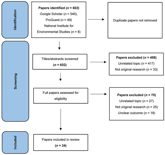 A preliminary search of the NIES, Google Scholar, and ProQuest databases for the phrase “climate security debate” yielded research papers and reports based on two research projects that were conducted in Japan. It should also be noted that the number of hits from the preliminary search was too large to conduct a fruitful review. For example, the search on NIES yielded 153 results (https://www.nies.go.jp/index-e.html, accessed on 15 March 2022) while Google Scholar returned 1,420,000 hits (https://bit.ly/3rwQsAm, accessed on 15 March 2022). After applying the string query (“climate security” discourse AND Japan AND policy debate), the total number of papers from the three databases was reduced to 602 English language papers, with 49 papers from ProQuest, 545 papers from Google Scholar (including duplicates from ProQuest, https://bit.ly/3uLfWMe, accessed on 15 March 2022), and 8 papers from NIES (Google search in the upper right corner, https://www.nies.go.jp/index-e.html, accessed on 15 March 2022). Unlike the Google Scholar and ProQuest databases, the NIES database does not have the option to apply all search criteria. The titles and abstracts of all 602 papers were scanned to ascertain clear relevance to the goal of our review. Whenever we are unable to make this determination in a single paper, the full text of the paper was scanned (or read when necessary) for relevance to the three research questions. For the evaluation of eligibility and relevance, we narrowed the number of papers to 34 (by specifically including the word Japan): 2 from NIES, 10 from ProQuest, 15 from Google Scholar, and 7 reports from a research project.