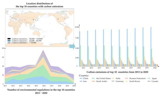 Driven by economic development and population growth [1], the carbon emission situation is not optimistic. Global carbon dioxide emissions rebounded in 2021, rising by 6.0% compared to 2020 [2]. In response, governments in many countries have actively enacted legislation to curb this situation. The number of environmental regulations and carbon emissions from 2011 to 2020 obtained by [3,4] are shown in Figure 1. In addition to the problem of increasing carbon emissions, society is also caught in a worrying environmental situation featuring water and solid waste pollution. It has been shown that 80% of global wastewater is discharged directly into the environment without treatment [5]. In terms of waste, the World Bank stated that global solid waste is expected to reach 3.40 billion tons in 2050 [6]. The unbalanced development of solid waste resource disposal and recycling rate has also made integrated solid waste management a heavy burden for society. However, against the background that various countries and regions are gradually paying attention to environmental issues, the complex and dynamic characteristics of social systems have generated more and more challenges for the government to face in managing environmental issues. According to the report released by the United Nations Environment Programme in 2021 [7], it is expected that the governments involved in the 2030 Paris Agreement will still not be able to achieve their target carbon emission reductions. Implementing green development behavior is a key move for governments to reverse this situation. A government can adopt incentive-oriented or mandatory-oriented green development behaviors to improve the green development level of its region. The subjects in a social system are interconnected and mutually reinforcing. When these subjects face government behavior, they also show different coping strategies, such as the green transformation of enterprises, the greenwashing of enterprises, increasing public green demand, and market greening. Therefore, how government green development behavior affects other social subjects is a topic worthy of discussion.