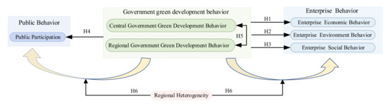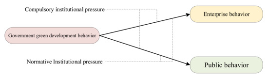 Government is the expression of an institutionalized political model [26]. In other words, governmental green development behavior is inextricably linked to institutional environment. Essentially, at the heart of neo-institutional theory is the binding effect of social structures acting on organizations. This binding effect manifests itself in three different forms: coercive pressure, normative pressure, and imitative pressure [27]. It follows that, unlike institutional theory, neo-institutional theory places more emphasis on institutional diversity. As mentioned earlier, from the neo-institutional theory perspective, governmental green development behavior acts as coercive and normative institutional pressure on the public and enterprises. When the public and enterprises are constrained by these two types of pressures, they will respond by exercising their subjective initiative as much as possible, e.g., in the form of obedience, resistance, and decoupling [28]. Previous studies have also explored the response of governmental green development behavior to the drive of the public and enterprises. Li et al. [8] revealed the driving path of environmental regulation on the implementation of green technology innovation in construction enterprises by constructing a vector autoregressive model. Chen et al. [29] revealed the driving mechanism of environmental law on public environmental behavior based on the theory of planned behavior. It is not difficult to find that when the public and enterprises face institutional pressure from governmental green development behavior, they usually choose to adopt or resist the proposed strategy.