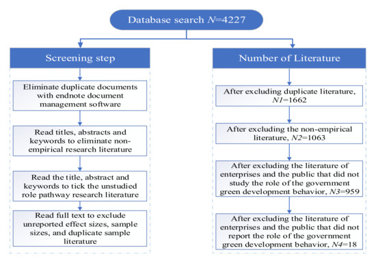 Furthermore, the authors of this study screened the literature with the following screening criteria to obtain studies that fit the objectives: (1) The target literature had to be empirical studies; (2) the target literature had to consider whether government green development behavior affects businesses/public; (3) the target literature had to report the sample size and effect size; and (4) the sample involved in the target literature had to be an independent sample. The specific screening steps are shown in Figure 4. Finally, a total of 18 studies were included in this study as the target sample literature.
