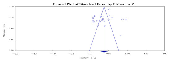 Unpublished literature, non-English literature, and gray literature were not included in this study because their use could have led to a situation of publication bias in the findings. Therefore, the authors of this study utilized funnel plots, Rosenthal’s fail-safe N, Begg and Mazumdar rank correlation, and Egger’s regression intercept methods to test for bias. First, the funnel plot was output using Comprehensive Meta-Analysis 3.0 (CMA3.0) software to perform a preliminary test of the target literature. As seen in Figure 5, the target literature was not perfectly symmetrically distributed. This was a preliminary indication of possible bias in this study.
