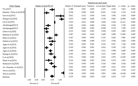 Considering the differences in the design of research methods and sources of research data used in the target literature, it was extremely necessary to test the heterogeneity of the studied literature. In this study, Q value and I2 were used to test the heterogeneity of the studies [62], and the results of the test are shown in Table 4. As can be seen from the table, the Q test had a p-value < 0.001 and Q-value > degrees of freedom (df). This indicates significant heterogeneity in this study. The test results showed that the I2 value was 95.625%, indicating that 95.625% and 4.375% of the observed variance in this study were caused by the true number of variances and random errors in the effect sizes, respectively. According to [62], an I2 value in the 75–100% range would indicate a high degree of heterogeneity in this study, and a τ2 value of 0.047 would indicate a 3.7% variance between studies. In summary, the authors of this study adopted a random effects model for analysis to cope with the heterogeneity between studies.