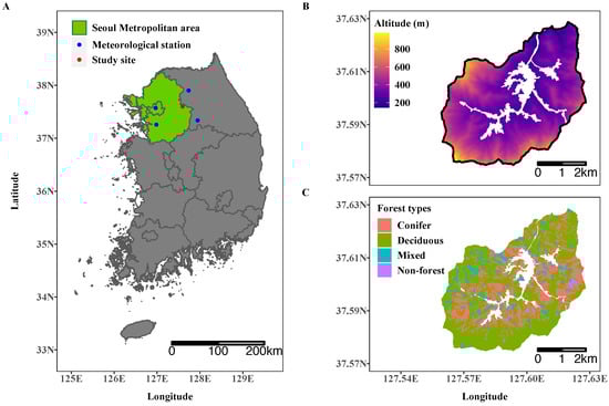 This study was performed in Saneum-ri, Gyunggi Province, where Saneum recreational forest, the largest national recreational forest in the Seoul metropolitan area, is located (Figure 1A). The total area of the site is approximately 2376 and the dominant land cover type is forest (93.6%), followed by agricultural land (5.2%), streams (0.6%), residential areas (0.4%), and roads (0.2%). The study site is a basin surrounded by Mt. Bongmi to the north, and Mt. Yongmun, Mt. Danwol, and Mt. Sori to the south (Figure 1B). Its altitude is in the range of 194 to 954 . The lower flat area of the study site is mostly used as residential and agricultural land and for roads. Forests cover the upper part of the study site with steep slopes, and are mainly used for recreational purposes such as hiking and forest bathing. In the study site, the forested land is composed mostly of deciduous (61.7%) followed by conifer (31.0%) and mixed (6.4%) forests (Figure 1C).