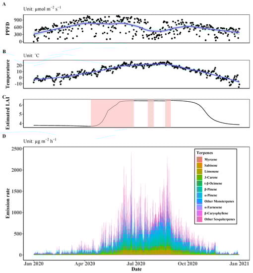 Temporal trends of the environmental and physiological input variables of the MEGAN model ((A) daily mean PPFD, (B) daily mean temperature, and (C) estimated LAI applying gap filling and smoothing) and the average terpene emission rate in Saneum-ri area in (D). Blue lines and shaded areas in (A,B) represent the smoothing lines and the 95% confidence interval using the locally estimated scatterplot smoothing (Loess) method. The red area in (C) represents the period with increased LAI.