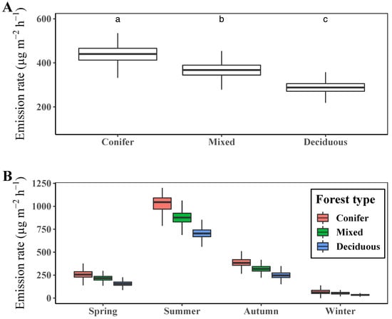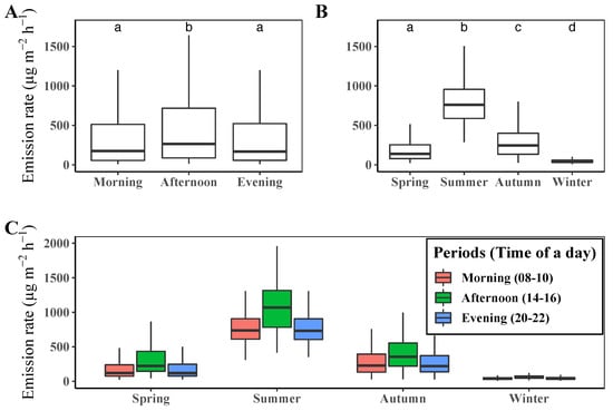 (A) Mean diurnal variation of terpene emission rate, (B) seasonal and (C) seasonal–diurnal comparison of the terpene emission rate of the year 2020 in Saneum-ri area. Different letters above the boxplots in (A,B) indicate significant differences (Dunn’s test p < 0.05) among mean values of terpene emission rate.