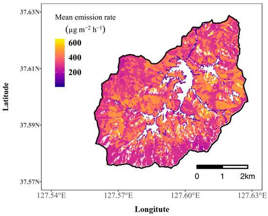 Although many in situ and experimental studies about BVOCs and terpene emissions in forests have been performed, only a few studies have attempted to quantify terpene emissions using a spatially explicit model suitable for assessing detailed therapeutic potential of forests. Meneguzzo et al. [] measured total volatile organic compounds (TVOCs) to understand the variability of BVOC concentration in a forest, considering the spatial characteristics of the forest including hilly sites, forest paths, and hiking trails. At a high temporal resolution, they analyzed the temporal patterns of BVOC concentration during the day, which showed peaks during a few hours after noon, and in the morning. Similar studies have been conducted in South Korea to investigate the spatial and temporal patterns of BVOC concentration in forests. Park et al. [] and Jeong et al. [] sampled terpenes at several plots in therapeutic and recreational forests, focusing on the temporal variability of terpene concentration over the course of a day and by season. In addition, Choi et al. [] characterized the effect of microclimatic factors on BVOC emission in bamboo groves located in an urban forest in South Korea by utilizing multilinear regression analysis. According to their study, BVOC emission from bamboo groves was positively correlated with the air temperature and humidity but negatively correlated with the wind and photosynthetically active radiation (PAR). Moreover, Lee et al. [] investigated the characteristics of spatial and seasonal monoterpene emission patterns in recreational forests in Gyunggi Province, South Korea. They classified recreational forests into four categories, namely natural recreation forest, arboretum, the forest park, and city park. However, given the limitations of field measurements of previous studies, such as a limited number of samples, it is difficult to generalize the spatial and temporal characteristics of emissions and the concentration patterns of human-beneficial terpenes.