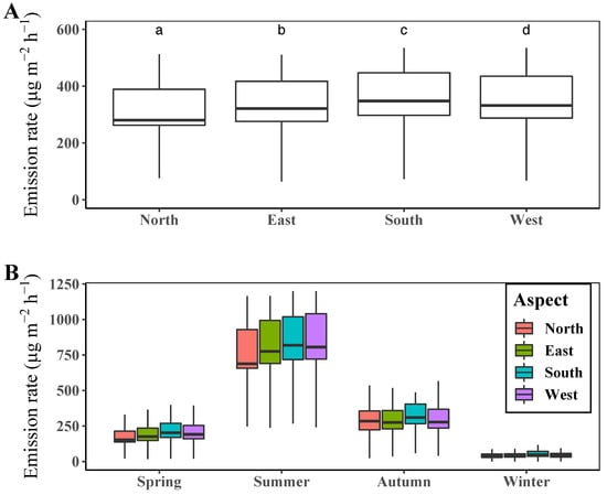 (A) Mean terpene emission rate by slope aspect during the whole year in 2020 and (B) for each season. Different letters above the boxplots in (A) indicate significant differences (Dunn’s test p < 0.05) among mean values of terpene emission rate.