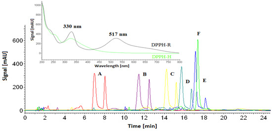 Overlaid chromatograms of 1 mM DPPH obtained by isocratic elution with 60% ACN/water (A, red) and gradient elution starting from 5%ACN (F, green), 20%ACN (E, blue), 30%ACN (D, light blue), 40% ACN (C, yellow), and 50% ACN (B, violet) and ending with 60% ACN within 20 min (detection, λ = 330 nm). Inserts show spectra of both forms recorded in the range of 200–800 nm by the DAD detector.
