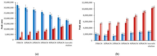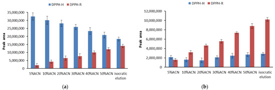 Comparison of the DPPH-R (red) and DPPH-H (blue) peak areas obtained using isocratic elution mode with 60%ACN, as well as gradient modes starting with 5%ACN, 10%ACN, 30%ACN, 40%ACN, and 50%ACN. The chromatograms were monitored at 330 nm (a) and 517 nm (b). The error bars indicating SD were calculated on the basis of three independent measurements.