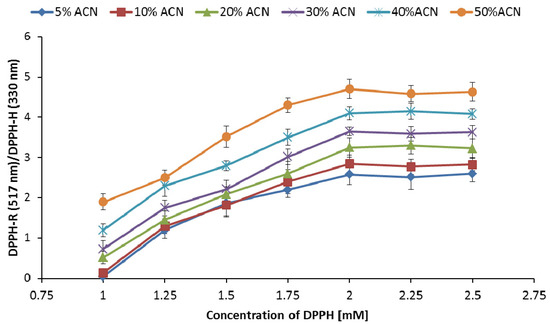 Effect of DPPH concentration on the DPPH-R/DPPH-H peak area ratio obtained using gradient modes starting with 5% ACN, 10% ACN, 20% ACN, 30% ACN, 40% ACN, and 50% ACN. The chromatograms were monitored at 330 nm (DPPH-H) and 517 nm (DPPH-R).